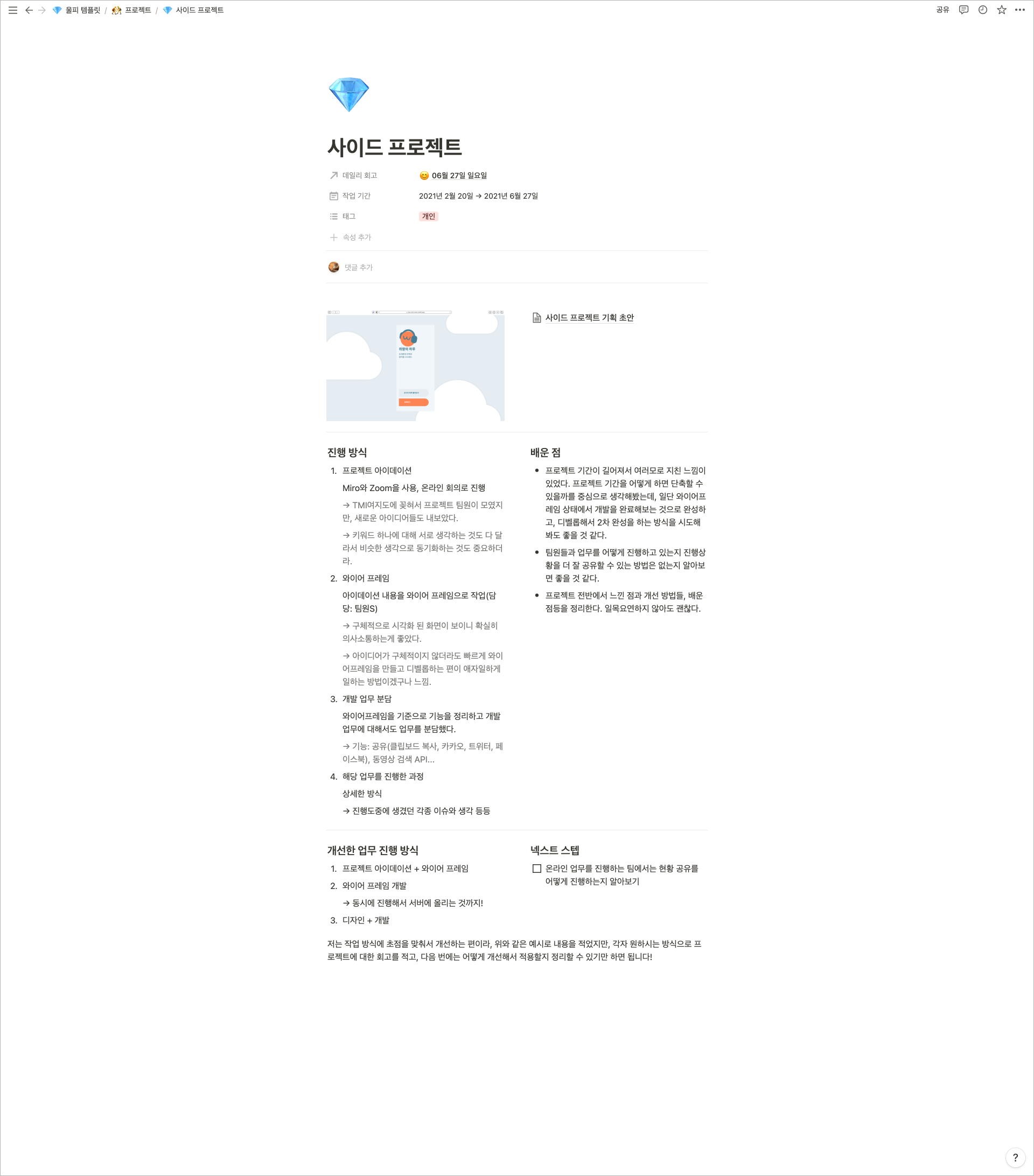 해당 날짜에 작업하거나, 공부하거나, 읽은 아티클을 연결해서 정보를 유기적으로 확인하기 쉽답니다! 특히 프로젝트의 경우, 여러 날 진행되기 때문에 이런 방식이 굉장히 도움이 많이 돼요. 💎사이드 프로젝트의 상세 페이지로 이동해볼게요.