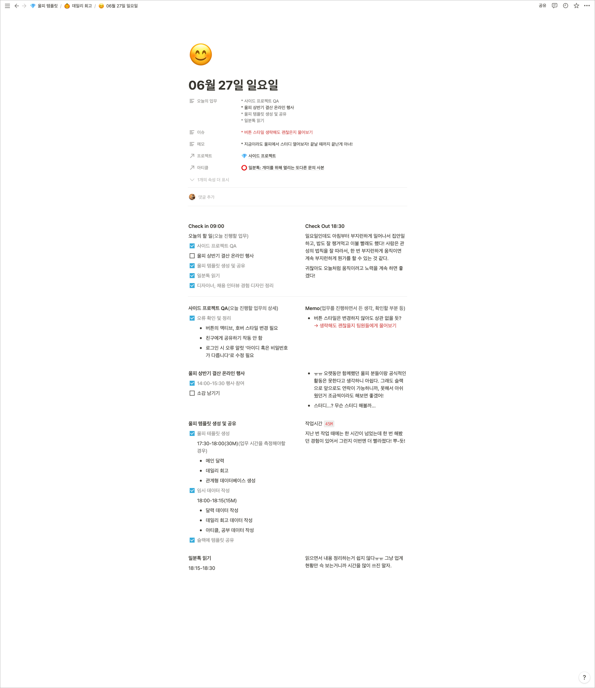 짜잔! 더미 데이터에 설명을 아주 자세하게 해두었기 때문에 또 덧붙여서 설명할 것들은 없을 것 같습니다. 큰 흐름만 이야기하자면, 처음에 일을 시작한 시간을 적고 할 일을 리스트업한 후, 아래에 상세 내역들을 기록하죠. 그리고 업무가 다 끝나면 체크아웃 시간을 적고 하루에 대한 회고를 짧게 적습니다.